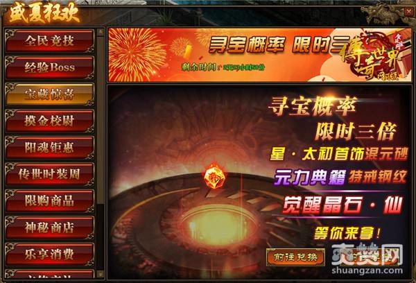 七月份的夏天是越来越热了,不如在《传奇世界网页版》来一场盛夏狂欢吧!这次盛夏狂欢活动不仅有全民竞技的新活动,而且寻宝奖励也是十分丰厚,各种觉醒晶石任你拿哦!