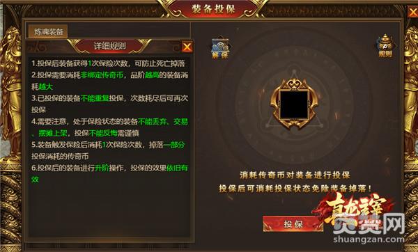 2. 投保需要消耗非绑定传奇币,品阶越高的装备消耗的传奇币也越高