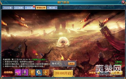 在每周二三五六的20:00-20:30,43u《妖神》将开启群魔乱舞活动。此活动为PVP玩法,大家可以在里面自由PK!获得胜利后,大家不仅可以获得丰厚的奖励,积分排名前三的宗门还可以获得参与神王战的资格!