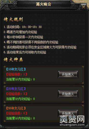 点击“开始烤火”,在篝火附近每隔10秒就能获得一次内功经验,花费元宝喝更高倍数的酒可获得更多内功经验,活动结束后就能领取累计的内功经验。