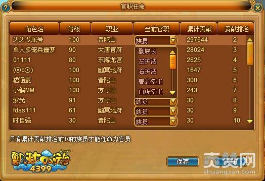 官职可以由族长、副族长和四大堂主任命,在家族厢房的成员管理中可以任命官职。其中副族长、左右护法和四大堂主必须家族累计贡献排名前10的玩家才可以被任命,四大堂主则可以任命自己所管辖的堂内的精英。