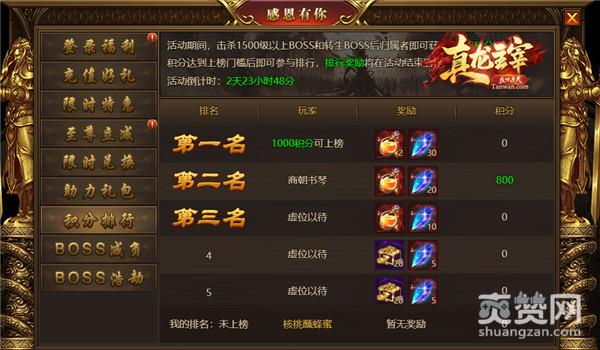 活动期间击杀1500级以上的boss和转生boss获得积分,活动结束后根据排行邮件发送奖励!