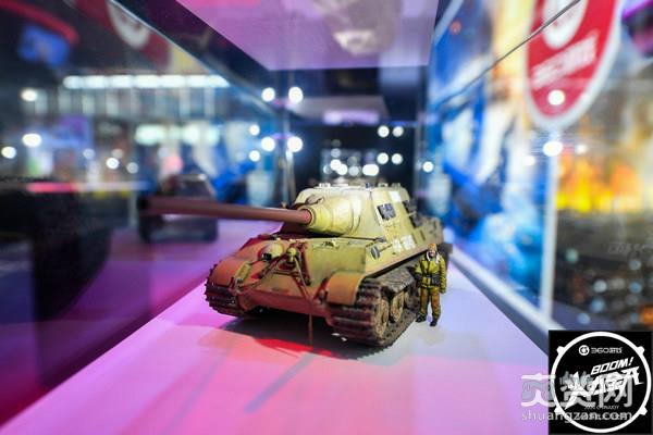 整个展台的装潢设计将各种战争元素运用到淋漓尽致,军工厂、演习场、补给站、火力场、弹药仓等等设施一应俱全,还有匠心打造的真实比例坦克战舰模型在场内陈列展出,吸引了众多军迷玩家驻足观看。