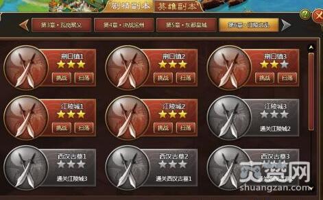 英雄副本则可以通过“支线任务”来完成,与剧情副本一样,达到“三星”通关后即可开启“扫荡”。扫荡上限为每日3次,花费元宝可增加扫荡次数。通过英雄副本可获得用于“武将升星”的“将魂”,当星级累计到一定数量后可获得元宝奖励。