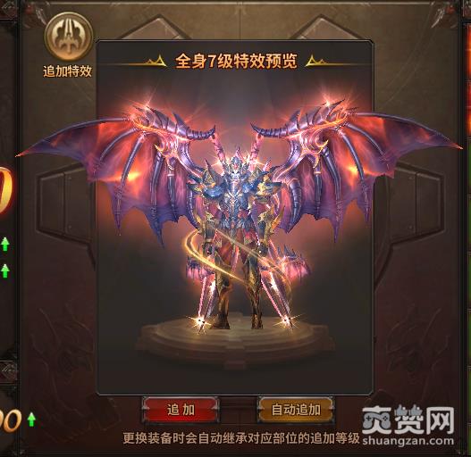 根据装备部位不同追加得到的属性也不同,武器和翅膀之类的部位,追加会得到攻击力和攻击百分比的加成,而防具部位则会获得防御力、生命值、以及防御力百分比、生命值百分百的加成。