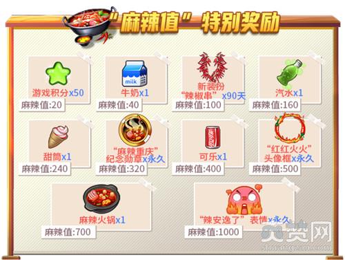 根据您在活动期间获得的“麻辣值”,可解锁特别奖励。当“麻辣值”达到1000后,每额外获得300麻辣值,可领取一份非绑定“麻辣火锅”!
