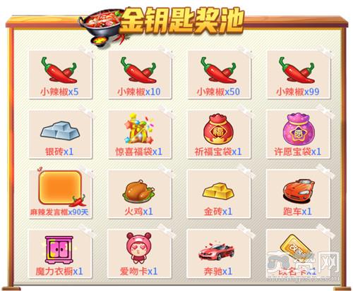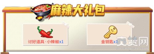 活动期间,“麻辣大礼包”限时出售,售价200金币,内含“讨好道具:小辣椒”和“金钥匙”各一份!接收“小辣椒”可兑换特别奖品,使用“金钥匙”可参与活动抽奖!
