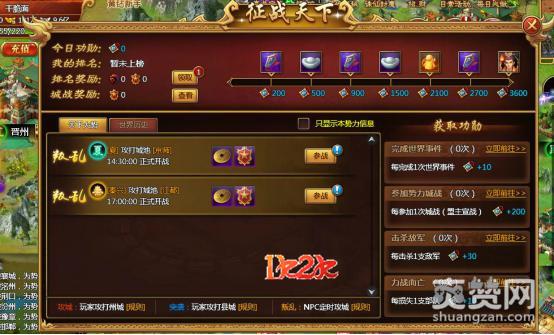 参加势力城战——每参加1场本世界攻城战(不包含突袭),将可获得200功勋