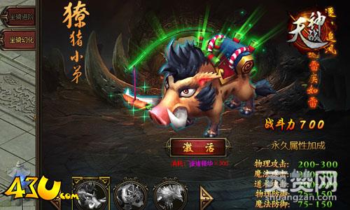 坐骑有三种幻化,即獠猪小弟、玄素熊猫和浴火凤凰,这些可是卖萌耍帅御敌的高手。獠猪小弟虽说其貌不扬,但可为玩家永久的加成大量的属性,是玩家的好帮手,而且可参加王城魔影活动,玩家就有机会激活此种坐骑幻化哦!