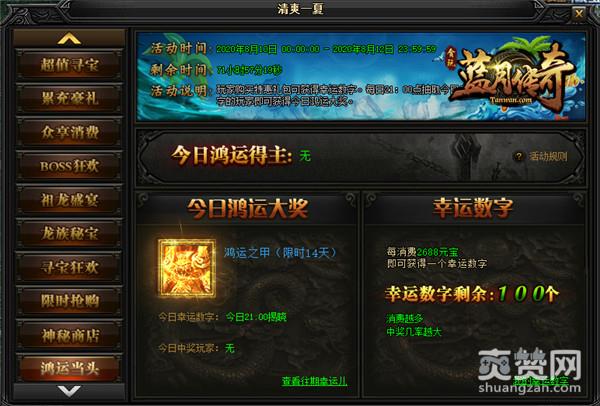 玩家每消耗2688元宝即可获得一个1-100之间的幸运数字。每日21点抽取今日幸运数字,拥有该数字的玩家即可获得今日鸿运大奖。说不定中大奖的人就是你哦!