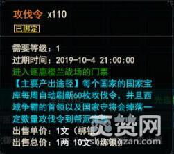 而逐鹿楼兰的门票攻伐令则可以通过两个途径获得,一个是每周一国家宝库自动刷新出60个攻伐令,另一个则是每周六的三个西域争霸世界BOSS。西域争霸世界BOSS被击杀后,会根据帮派伤害进行排行,伤害最高的帮派获得40个攻伐令,攻伐令将自动进入帮派宝库。