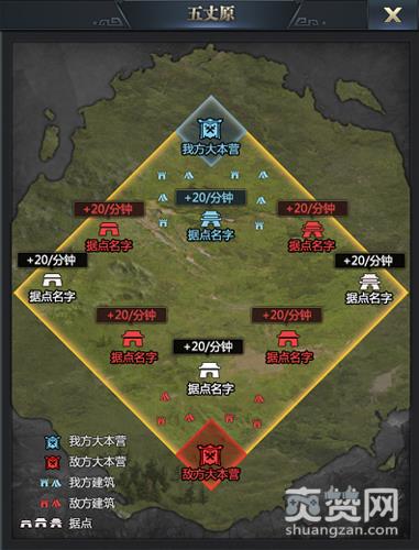 比赛开始后,主公们可以部署军团从己方大本营处出发(最多同时部署6个军团),行军进攻地图上任何一个敌对联盟占领的据点,据点会持续产出分数或补给物资。待到战斗时间结束,根据占有的据点产出积分,积分高者则获胜。需要注意的是,在比赛中主公们需要在有限视野范围内以步步为营的行军方式作战,盟友之间通过互相协同,尽可能占领重要的战略据点,才能获得更多积分,赢得最终的胜利!