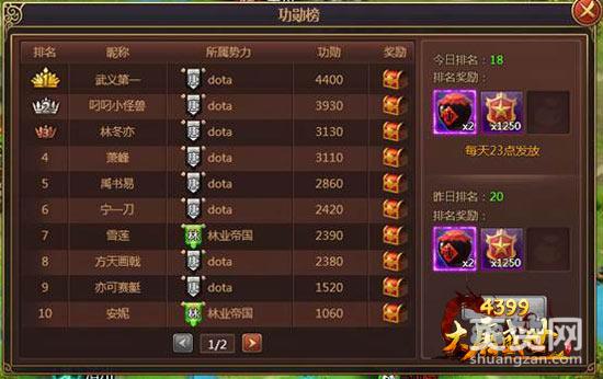 在今日功勋信息显示出点击“领取”或者“查看”,可查看今日功勋排行,如下图所示: