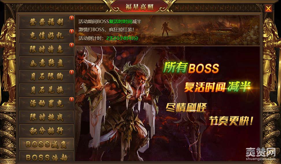 活动期间所有boss复活时间减半(跨服boss除外),击杀1500级以上的boss和转生boss获得积分,活动结束后更加排行邮件发送奖励。Boss杀的越多,奖励越丰厚~