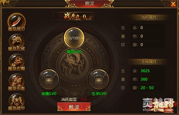 而巃皇战装还能够进行附灵,附灵后的战装则会增加大量属性值。但附灵需要消耗巃霊或巃髓,可通过运营活动获得。想要附灵,就需要将“复苏”、“制衡”、“生杀”提升到一定等级才可解锁。