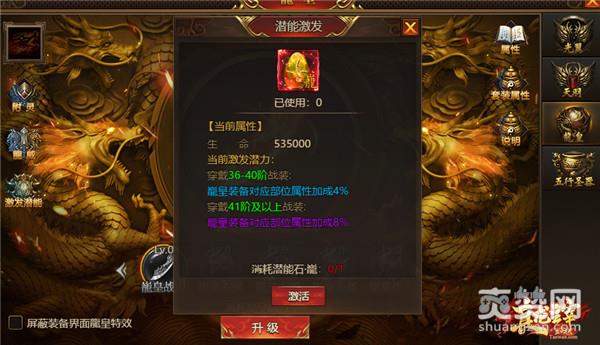 消耗潜能石·巃,就能够激活潜力:穿戴36-40阶装备时,巃皇战装对应部位属性加成4%;穿戴41阶及以上战装:巃皇装备对应部位属性加成8%。
