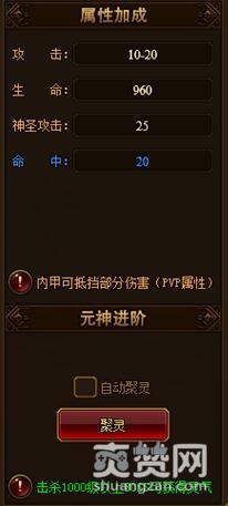 当风火雷电四个能量球聚灵后,元神就可以进行突破进阶了。元神突破需要元神突破丹,这个可以通过每天的元神任务获得,也可以在商城购买,每天限购5个。每次成功突破后都可以获得大量的内甲值增长,获得抵消伤害的效果!
