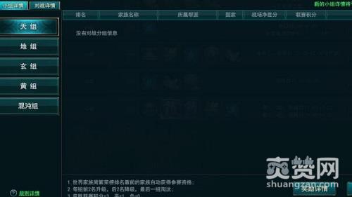 胜+3分,平+1分,负+0分,按积分进行排名。小组前2名升级,后2名降级,升降级结束后,处于最低级混沌赛区的家族将被直接淘汰。新赛季根据新的世界家族周繁荣榜,去除在天地玄黄四个赛区的家族后,最高的6个周繁荣度最高的家族补充进混沌赛区,开始新赛季。
