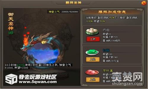 玩家每天只能膜拜龙神1次,每次上供之后可得到一定的声望和增加祝福次数。声望的数量由供品的品质决定,供品品质越高,玩家得到的声望值越大。在膜拜龙神中,玩家最多可增加120次的祝福次数。
