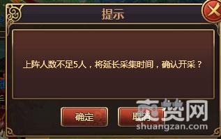 上阵人数最多不超过五人,上阵人数越多,开采时间越短,人数越少,时间则越长。当上阵人数不足五人时则会弹出吐下提示:
