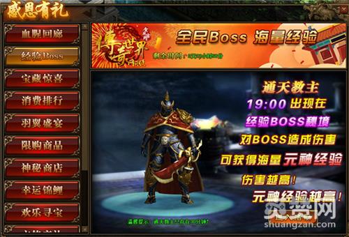 活动期间,每天19:00将在BOSS秘境中刷新BOSS,玩家可前往挑战,玩家对BOSS造成的伤害,将在活动结束后转换成元神经验并发放。温馨提示:可使用攻击药水,暴击药水的药品来获得更高的伤害,更多的经验哦~