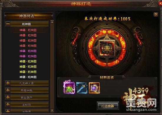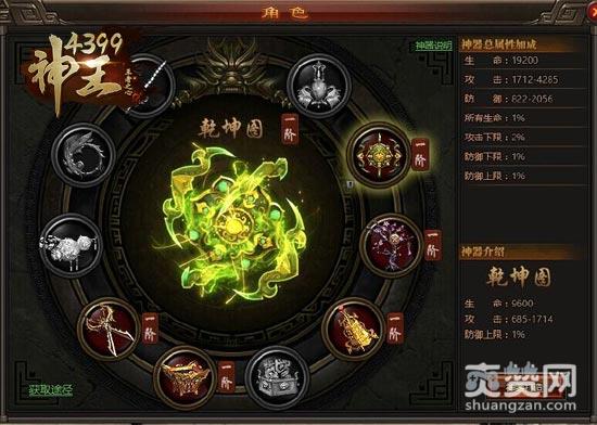 神器是《4399神王》中的一个重要系统,通过神器装备可大幅强化属性。在人物界面的左下角点神器会跳转到神器界面,在各大主城的“神器锻造NPC”处合成高级神器。