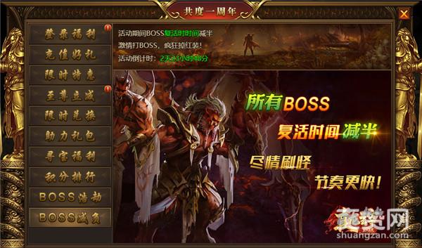活动期间所有boss复活时间减半(跨服boss除外),击杀1500级以上的boss和转生boss获得积分,活动结束后更加排行邮件发送奖励。Boss杀的越多,奖励越丰厚~