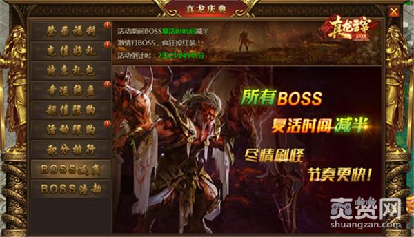 活动期间所有boss复活时间减半(跨服boss除外),击杀1500级以上的boss和转生boss获得积分,活动结束后更有排行邮件发送奖励。Boss杀的越多,奖励越丰厚~