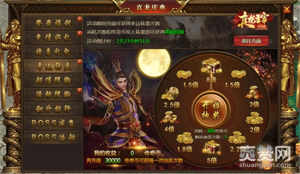 【幸运转盘】活动期间充值可获得转盘次数,拥有次数时可用传奇币转动转盘,可获得倍数返利。最低1.5倍,最高可获得8倍传奇币返还!