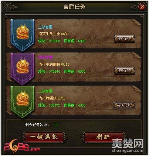 点击任务后面的【传】即可传送至任务接取处,官爵任务为获取官爵值奖励的任务,任务等级分为5级,任务等级越高,奖励越丰厚,可使用2000金币刷新一次任务,刷新后有几率使得当前3个可接取任务提高星级,也可选择一键满级,花费10元宝将3个任务提升至5级。
