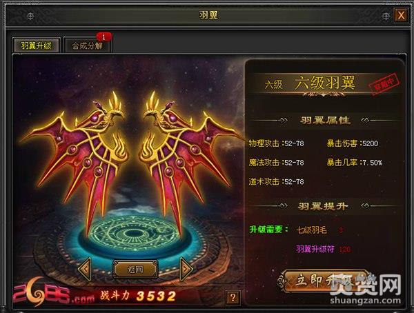 羽翼可获得新的暴击伤害和暴击几率属性,羽翼等级越高,属性也越高
