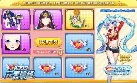 09月03日—09月09日期间,,每日充值可获得抽奖次数,每日最高可抽取6次。奖池内含永久绝版服装及座椅等豪华奖励,还可用获得的好运水晶在水晶商店兑换绝版道具哦~