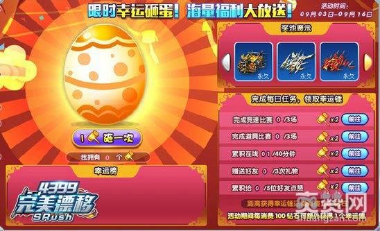 09月03日—09月16日期间,完成每日任务,领取幸运锤,幸运砸蛋,开启超值大奖!每消费100钻还可额外获得1个幸运锤哦~