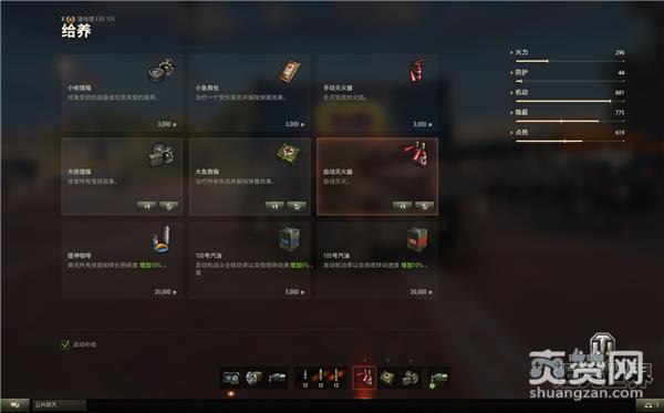 想要装备给养,您可以点击任何一个位于坦克面板的给养栏位,之后即会弹出维护窗口,可先将鼠标移至该类型给养上,了解其属性及功用,点击购买后,给养即会被自动安装到您的坦克上。此外,在页面选择自动补给,还可使该坦克在日后的每场战斗后自动购买并安装所需给养,大大简化您的操作哟!
