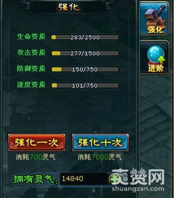 坐骑可以通过消耗灵气进行资质强化,使主角享受的坐骑属性加成增加。坐骑资质提升满后,就可以进阶坐骑,进阶坐骑消耗一定数量的灵气和对应坐骑的碎片。进阶成功后,坐骑资质上限提升,同时坐骑的天赋等级和光环等级也得到提升。