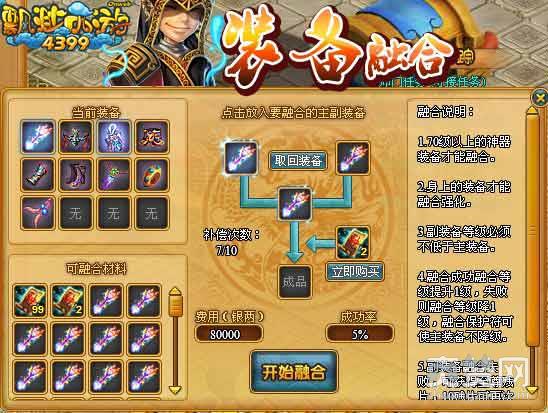 《4399飘渺西游》装备融合怎么玩?在人物装备的面板上可以看到融合的按钮,点击可以打开融合界面。在融合界面左侧可以看到人物当前穿着的装备和包裹中拥有的装备。分别点击当前人物的装备和包裹中可融合的材料装备放入右侧融合栏就可以融合了。