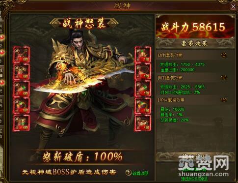 战神一怒,力斩破盾!在43u《封天战神》中还可以通过战神宝库兑换或击杀圣域BOSS收集战神装备。集齐一定战神装备后可获得套装效果,为角色提供大量属性加成,穿戴10件战神装备后还可获得怒斩破盾效果,无视神域BOSS护盾造成伤害!