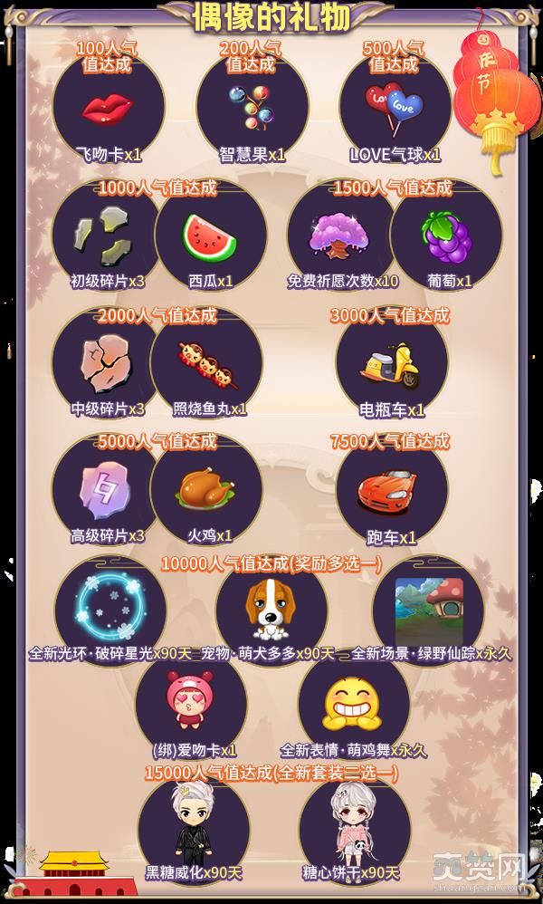 根据你为偶像贡献的人气值,可领取不同奖励: