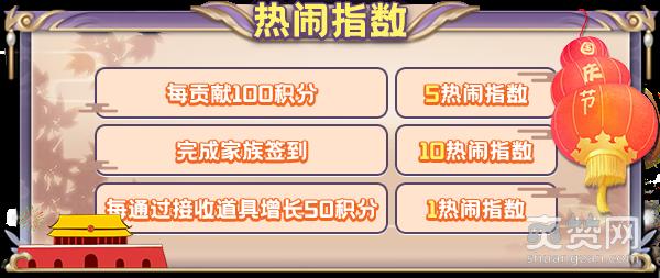 在每个家族,根据家族的”热闹指数”,可开启对应的奖励领取等级(每天至少贡献50热闹指数的族员可领取),每个家族的“热闹指数”每天清零,但不影响“家族总榜”排名。