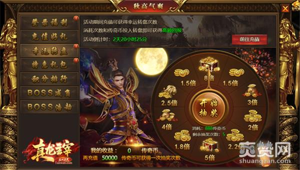 活动期间充值可获得转盘次数,拥有次数时参与传奇币转动转盘可获得倍数返利。最低1.5倍,最高8倍的传奇币返还,你心动了吗?