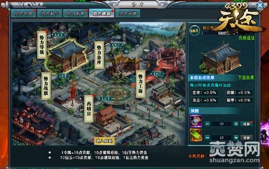 势力建筑共有五大建筑内容,等级、战旗、金库、药膳房、工坊。玩家可以用对应建筑内容的令牌进行捐献或元宝捐献,可获得门贡、建筑经验和势力资金,建筑等级越高所获得到的奖励与加成越好。