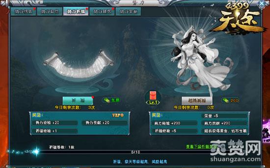 势力祈福分为普通祈福和超级祈福,祈福可以获得超值的道具奖励与经验奖励,提高VIP等级还可以提高祈福次数,超级祈福势力全员均可获得对应奖励。