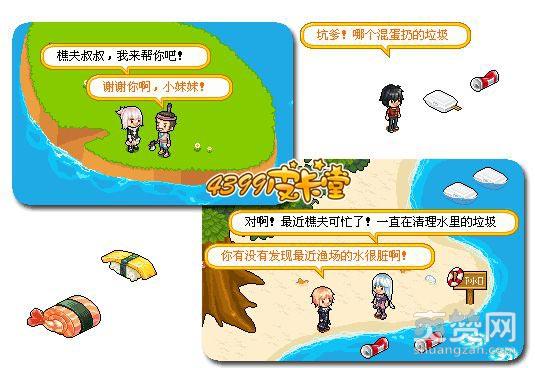 《4399皮卡堂》的皮卡亲们来渔场帮忙打捞各种垃圾吧!会有一些小小的礼物作为回报哦!如果你能打捞到足够多的垃圾,将有一份大惊喜送给你哦!