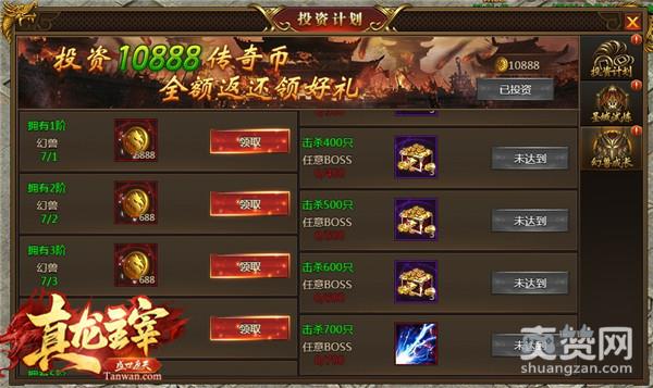 在第一天每位兄弟们都会拥有一只属于自己的幻兽,并且还可以为幻兽购买技能使战斗力变得更加的强劲。其中幻兽就像是一个孩童,它的长大一样需要我们对它进行投资,所以第二天必点投资计划,投入少量的传奇币获取更大的回报。温馨提示一下,每当完成一个投资计划都将会返还一定数额的币,并且累进金额更加大还有幻兽最为重要的技能——分裂。拥有了分裂,幻兽便能同时攻击目标,这对于打怪来说无疑是一个巨大的好消息。
