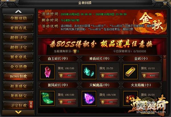 活动期间内,玩家击杀BOSS获得“boss积分”,“boss积分”可用于兑换血玉碎片、披风碎片、火龙碎片等多种材料。但是兄弟们要注意哦,每种材料均有兑换次数限制,并且“boss积分”在活动结束后,将清除归零。所以大家要记得及时兑换哦。