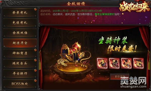 活动期间,不仅有高转武器、首饰限时抽取,更有坐骑神装限时抽取!兄弟们赶紧骑着新坐骑,迎接我们代言人的诞生吧!