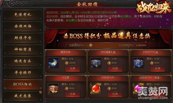 活动期间,玩家击杀BOSS可以获得“boss积分”,“boss积分”可用于兑换蓬莱秘卷、修为丹等材料。但是兄弟们要注意,每种材料均有兑换次数限制,并且“boss积分”在活动结束后,将清除归零。所以各位兄弟们要注意即时兑换哦。