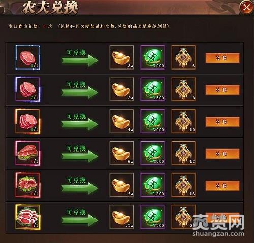 奖励每日最多可兑换3次,所有品质的肉共享兑换次数,兑换的品级越高越划算。比如1品猪肉只可兑换2万绑定元宝、1000玄玉以及6个换镖令,但是6品猪肉可兑换15万绑定元宝、7500玄玉、20个换镖令,建议大家可以积攒3个6品猪肉前往兑换哦!
