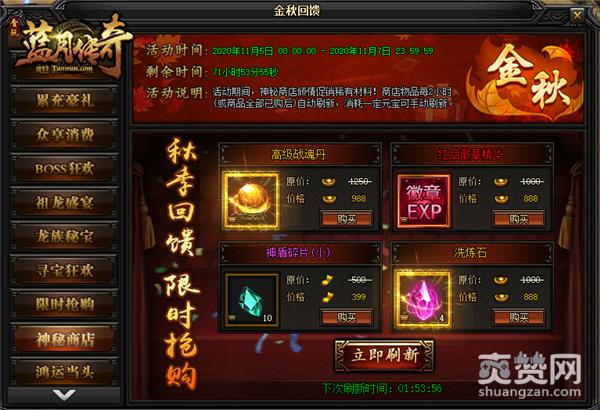 活动期间,副本卷轴、龙魂精通、内功丹、魂石结晶多种材料将在神秘商店倾情促销!活动折扣大,物品价格低!小编温馨提醒一下,商店物品每2小时自动刷新(或全商品全部已购后),消耗一定元宝可手动刷新。