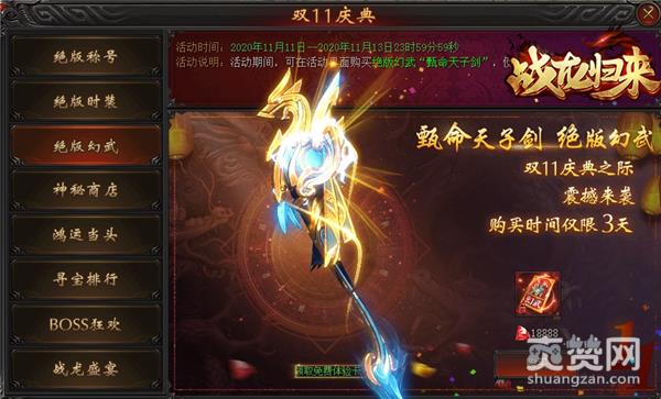 活动期间,玩家可在活动界面购买绝版幻武“甄命天子剑”,使用后永久生效!代言人精炼开光后的绝世宝剑,冷峻的外型是散发着夺目的光芒,华丽的战斗特效带给兄弟们舒适的游戏体验。